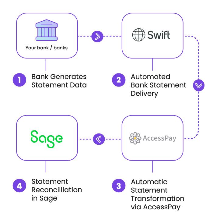 1. Connect bank via Open Banking (once setup, updates automatically). 2. Transactions sync daily into Sage 50. 3. Sage suggests matches for invoices, payments, or expenses. 4. User reviews, confirms, or adjusts. 5. Bank account reconciled automatically with minimal effort.